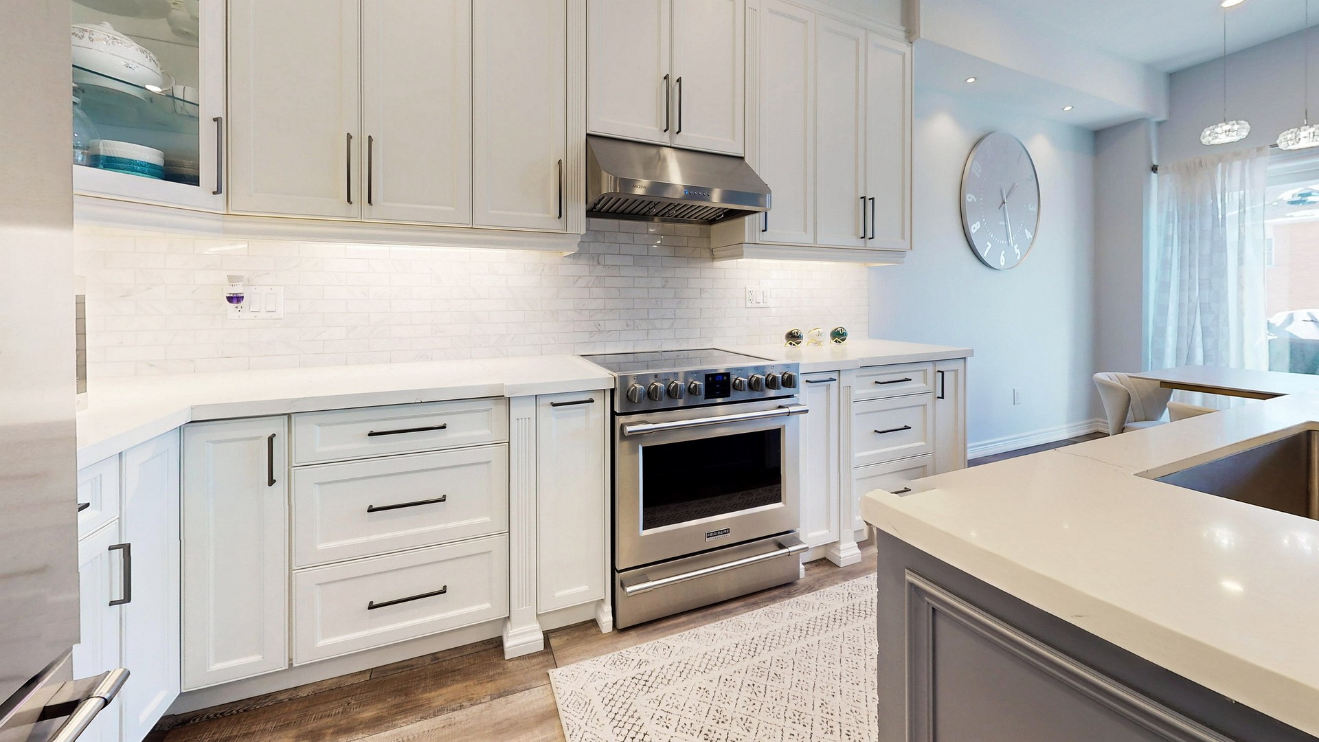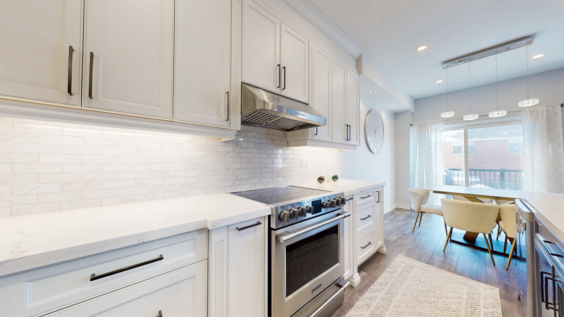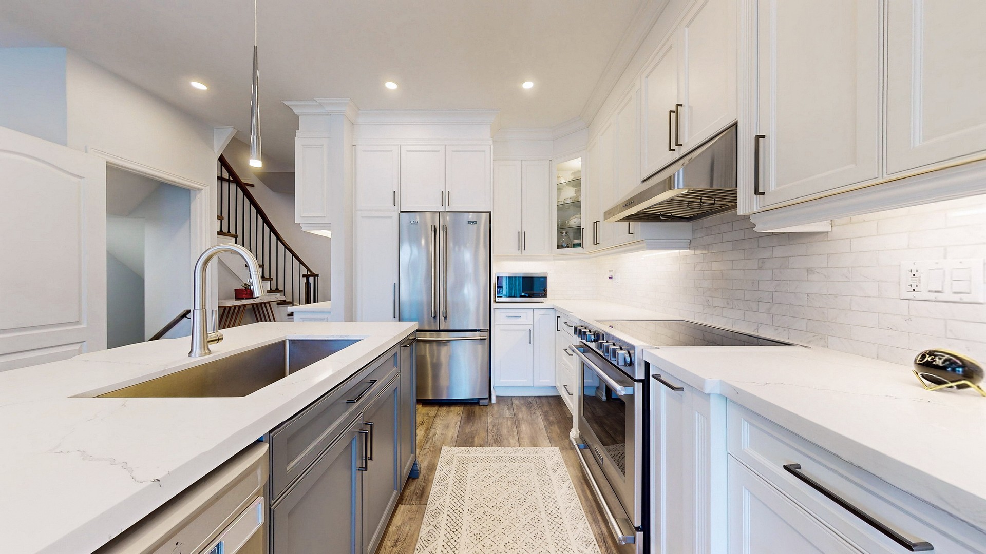 Step into the custom-designed chef’s kitchen, showcasing sleek white cabinetry, gleaming high-end quartz countertop, an eye-catching designer backsplash and premium stainless steel appliances—a true culinary masterpiece. The bright and airy open-concept living and dining areas are bathed in warm illumination from recessed pot lights creating an inviting ambiance. From here, step out onto an oversized deck, perfect for outdoor entertaining or quiet morning coffee. Adding to the convenience, the main floor provides direct access to the garage as well as a convenient nook with built in desk from which to pay bills or look up recipes.