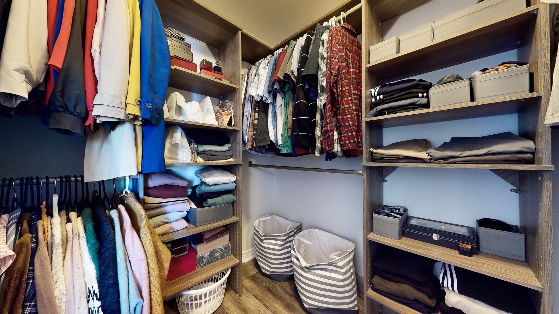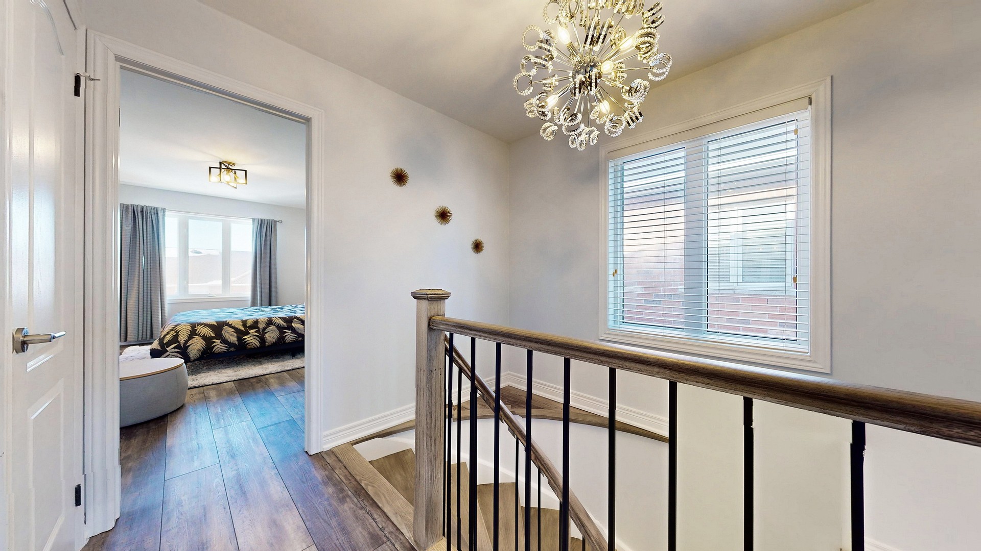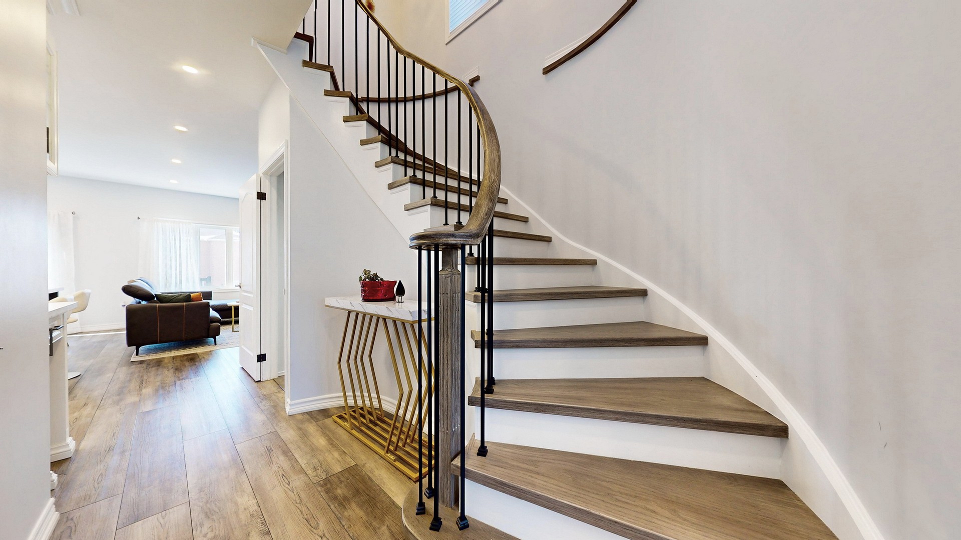A newly installed solid wood spiral staircase with wrought iron spindles is a display of elegance in the center of this home.