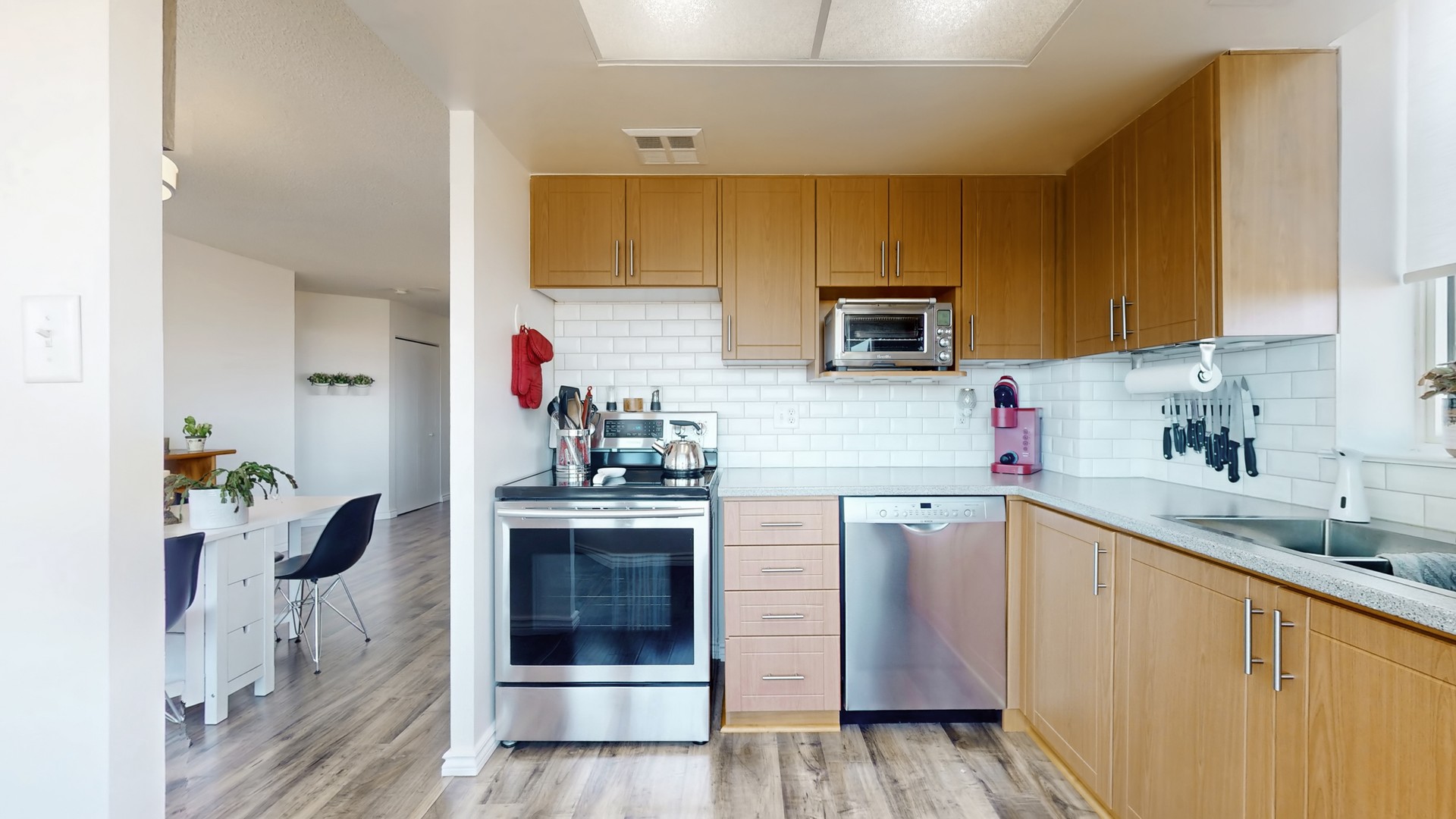backsplash, modern sink, and sleek stainless-steel appliances — all updated just five years