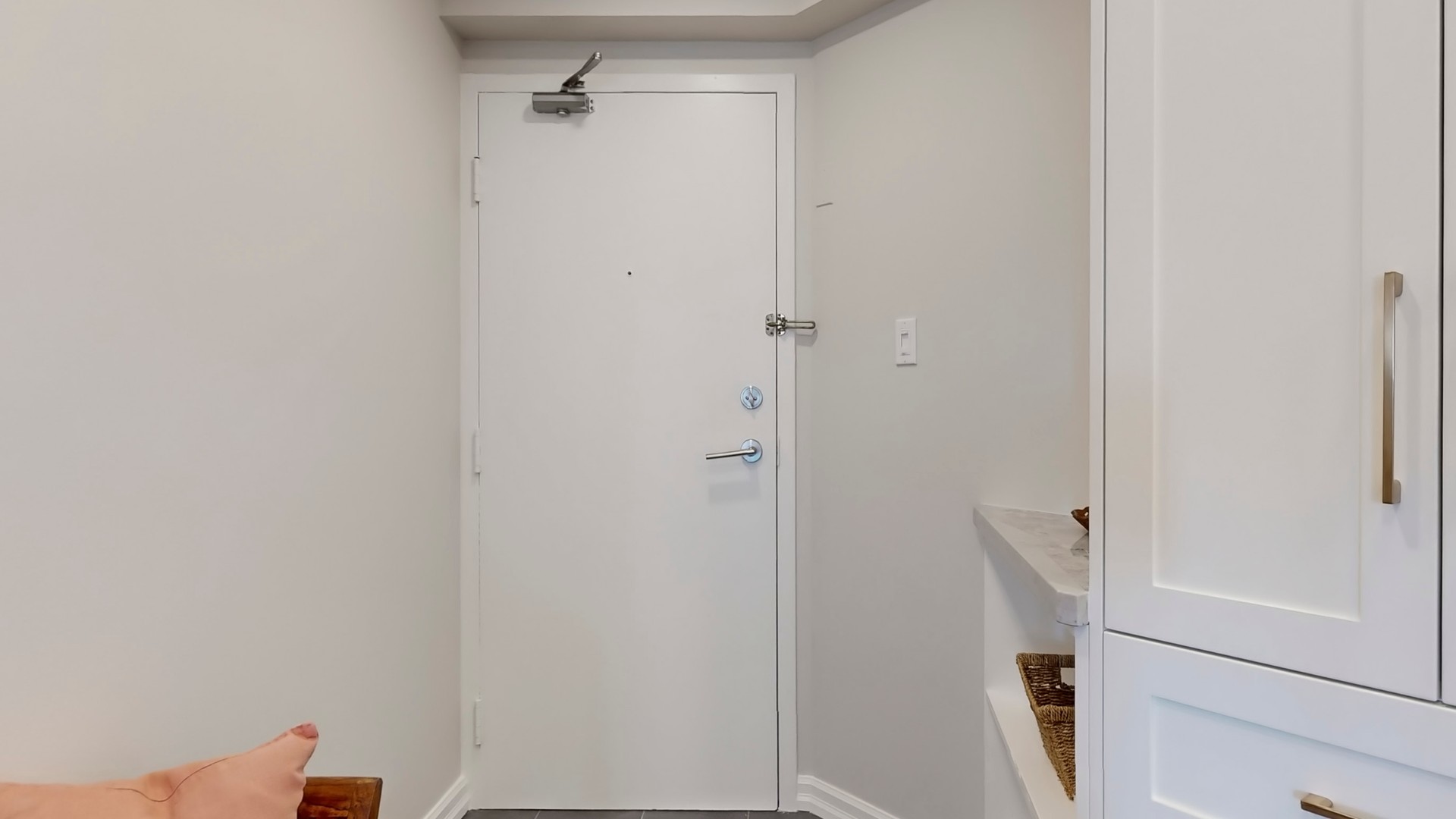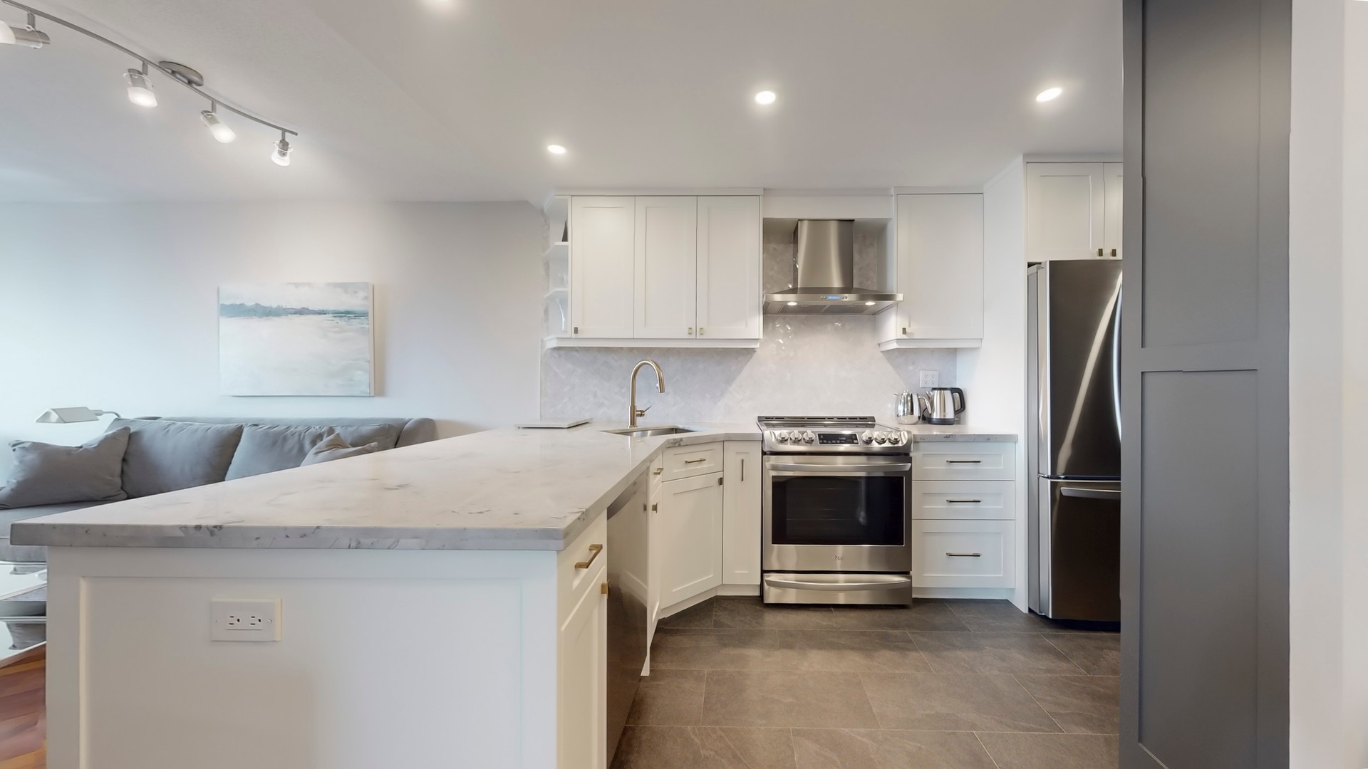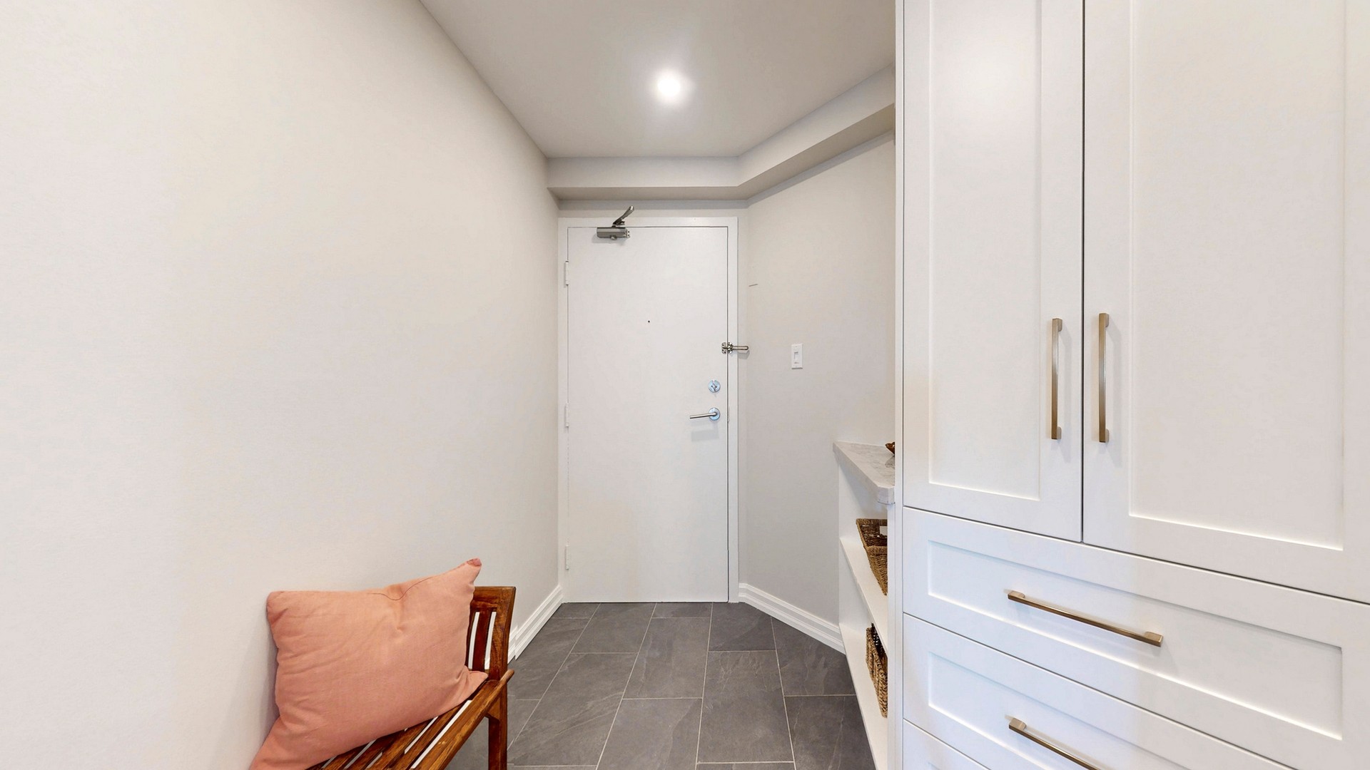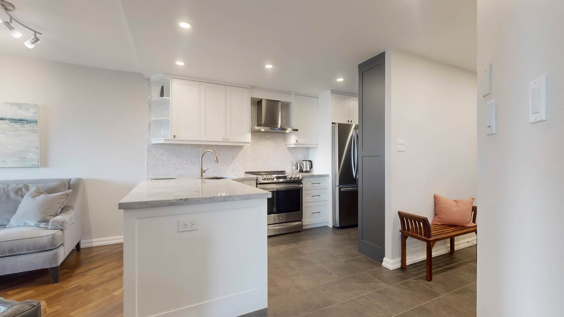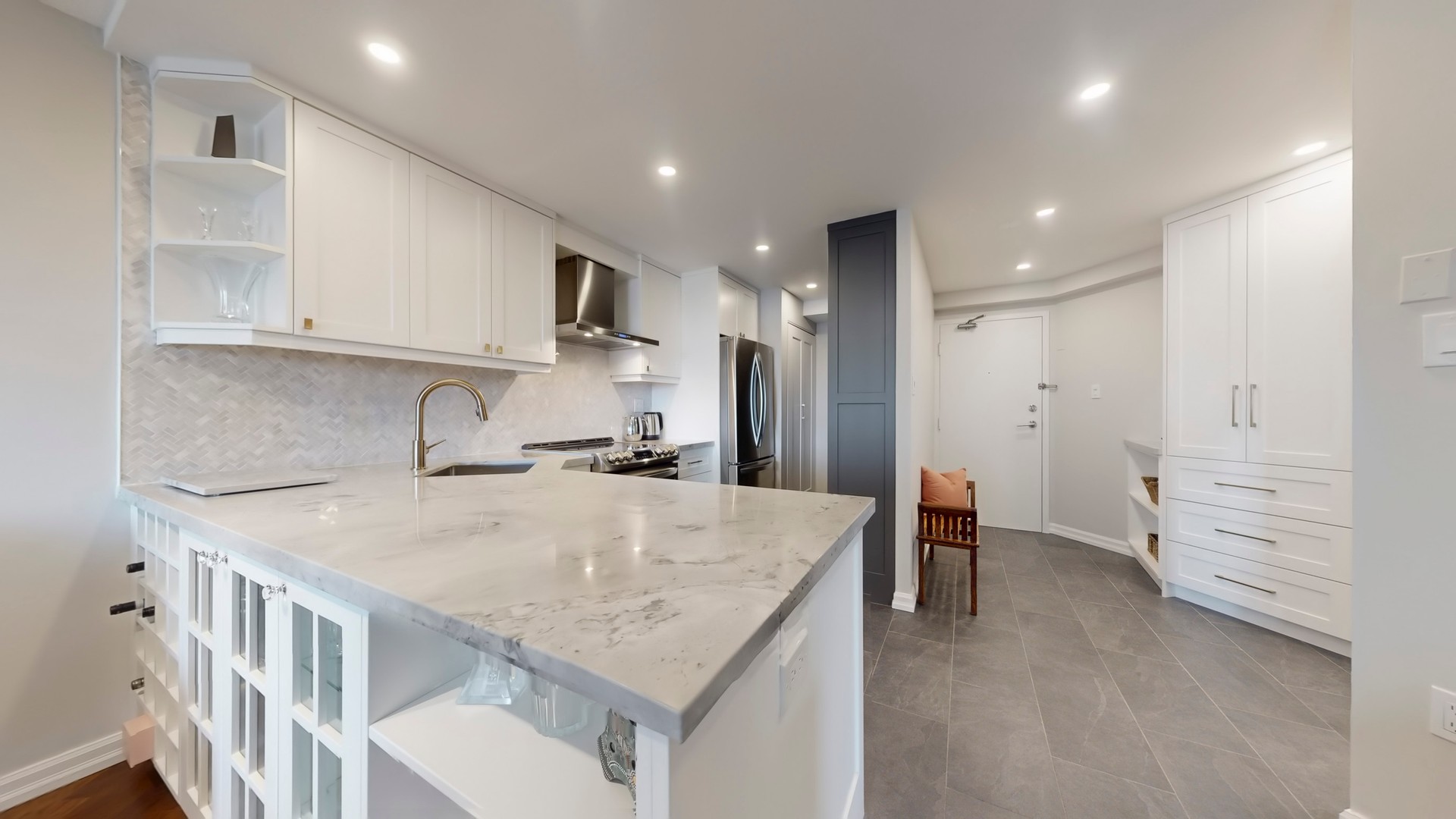 The entryway features custom full-height cabinetry and slate-toned tile leading into a fully redesigned dream kitchen with matching custom cabinetry, a double-depth peninsula with wine storage and bar display, and natural quartzite slab counters throughout.