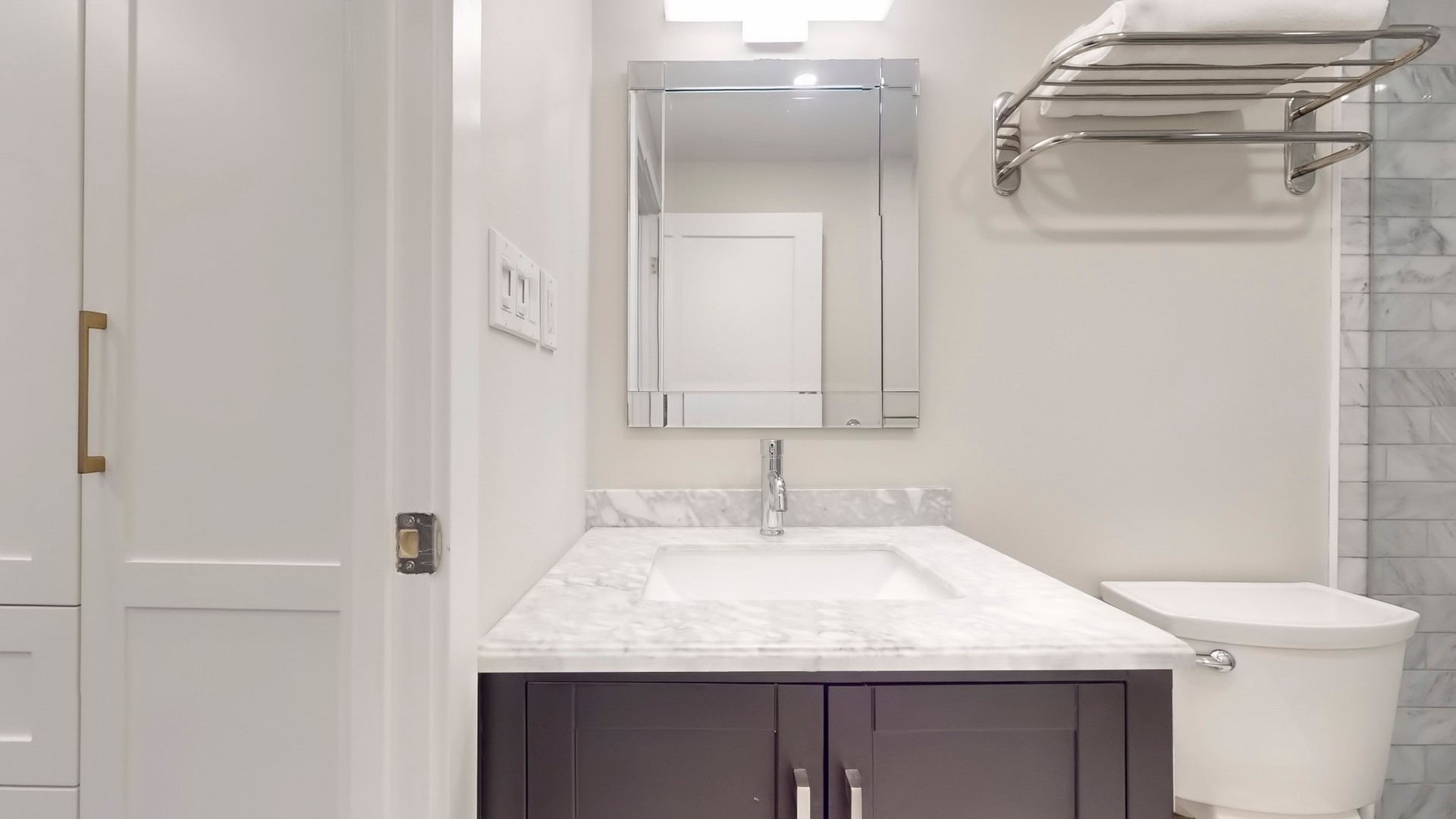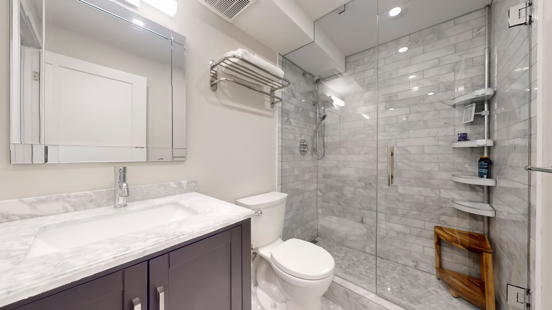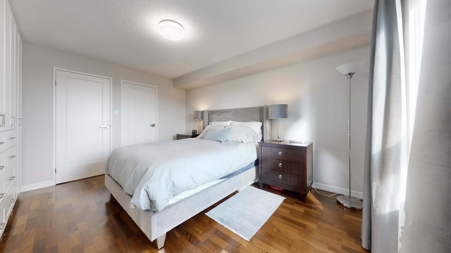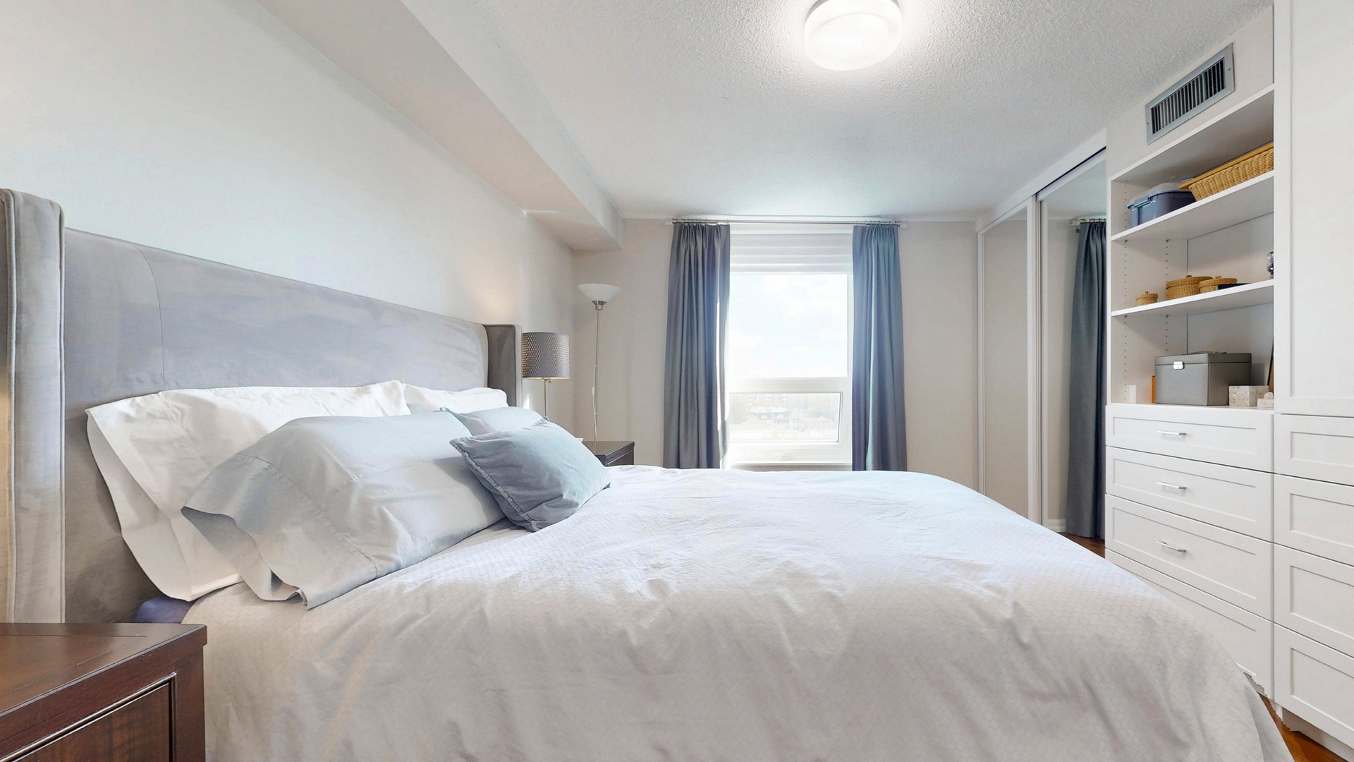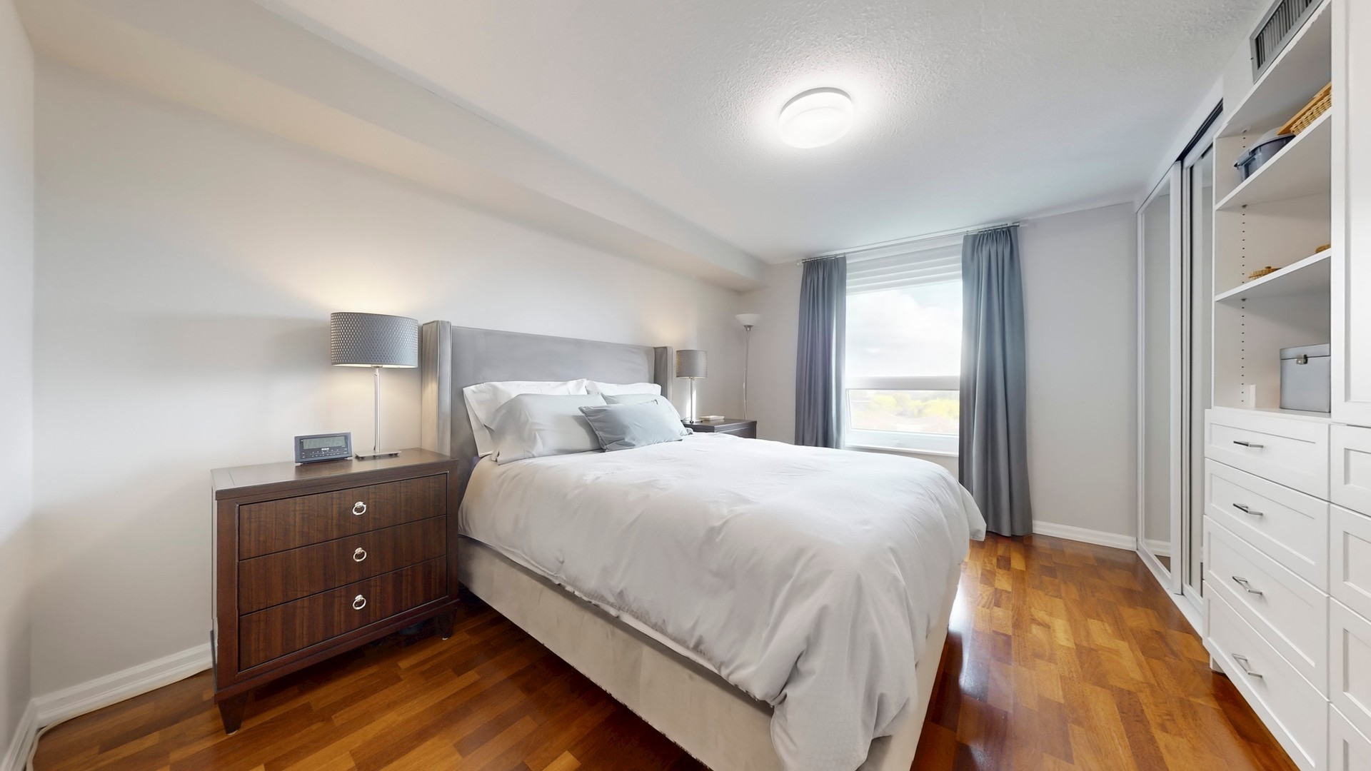 The primary bedroom includes full-height wardrobe cabinetry with cupboards and drawers — no dresser needed — plus custom-fitted closets in both bedrooms. The ensuite boasts a quartz vanity and honed marble mosaic tile; the main bath features a marble-tiled walk-in shower and marble vanity. Both bedrooms enjoy large picture windows capturing the morning sun.