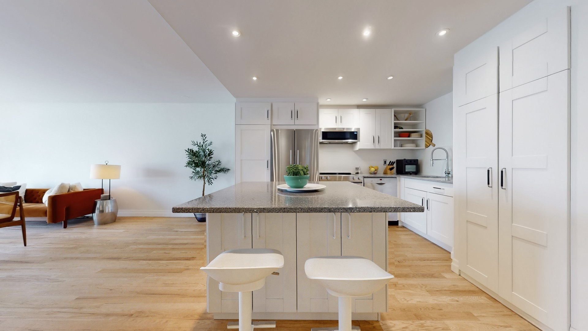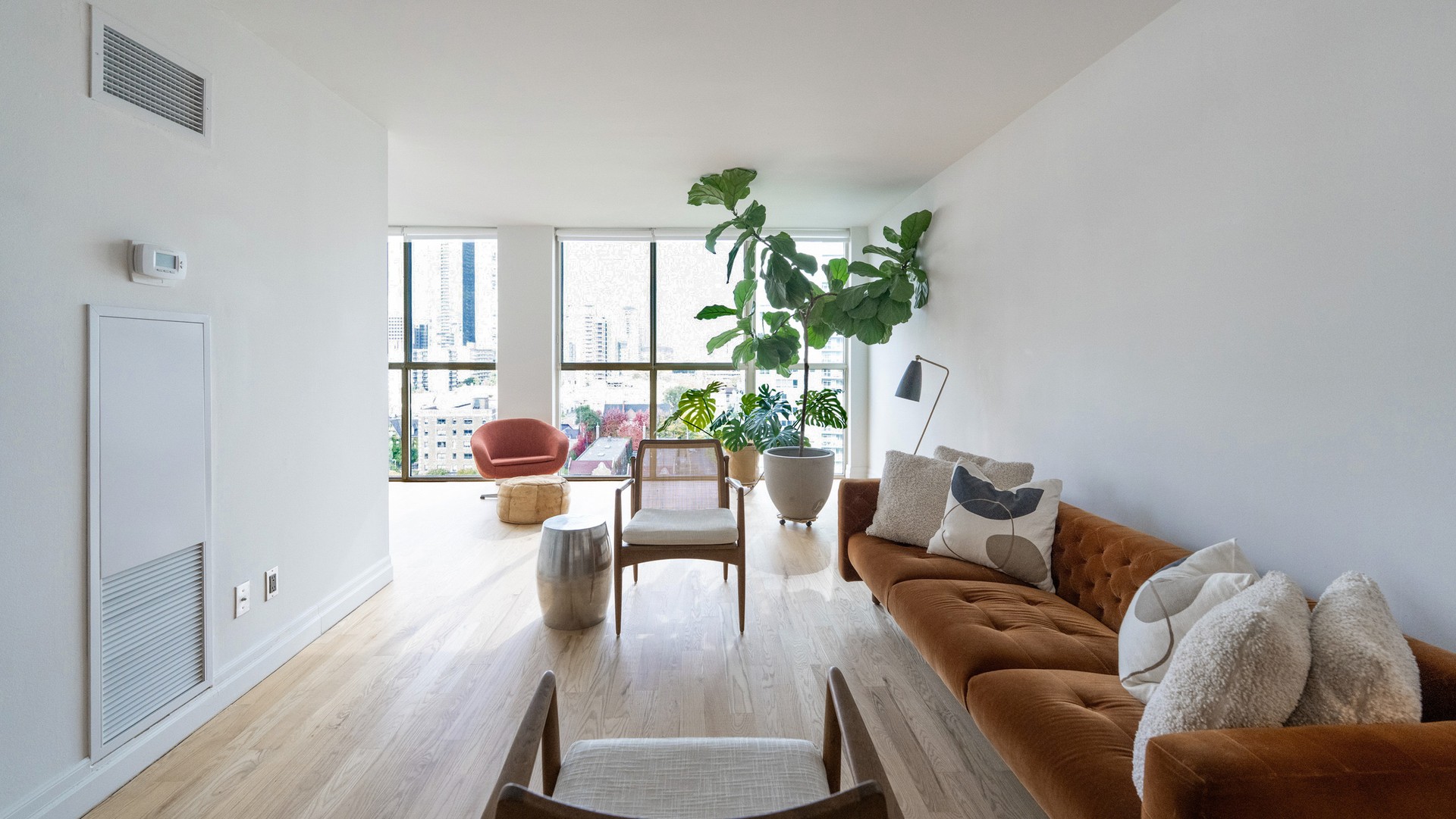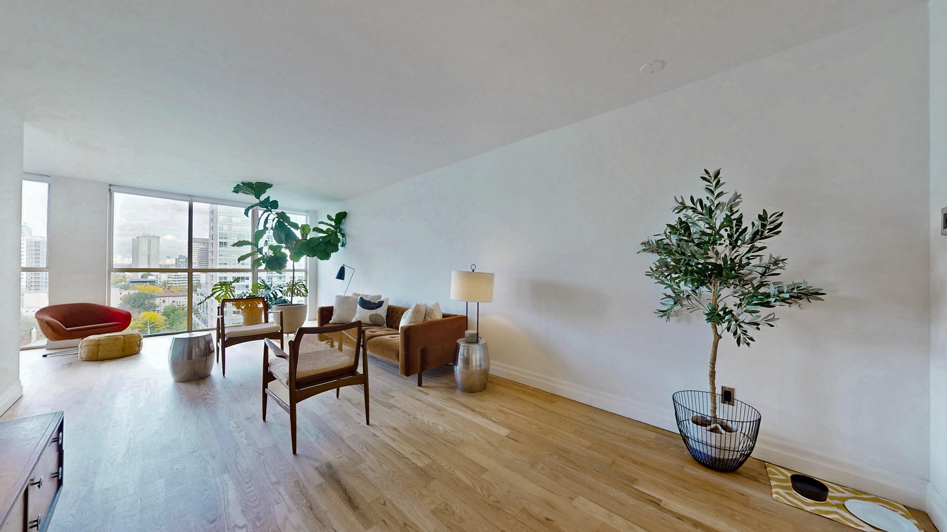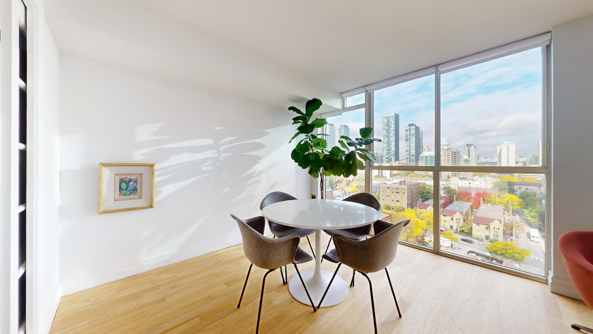 The bright, open-concept layout features a modern kitchen with centre island, updated bathroom with walk-in shower, new lighting, and vanity, and a stunning 21-foot wall of floor-to-ceiling windows showcasing spectacular city views.