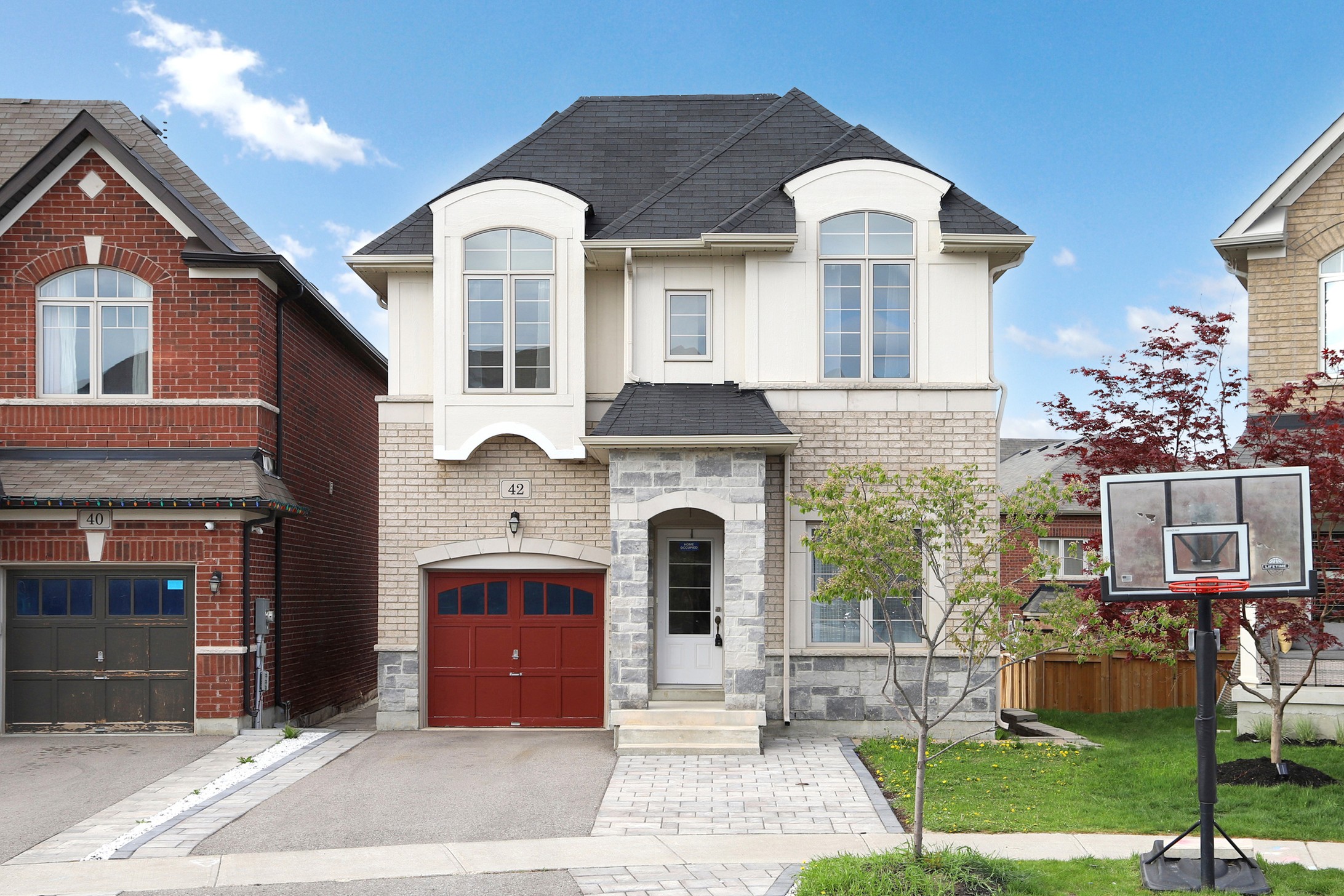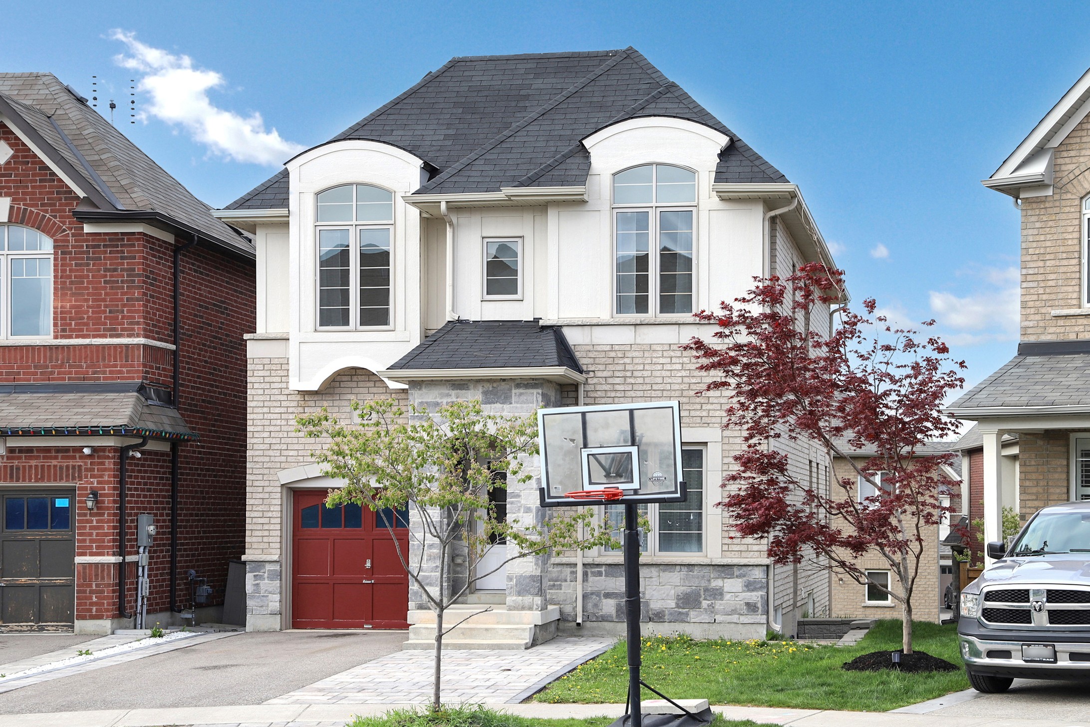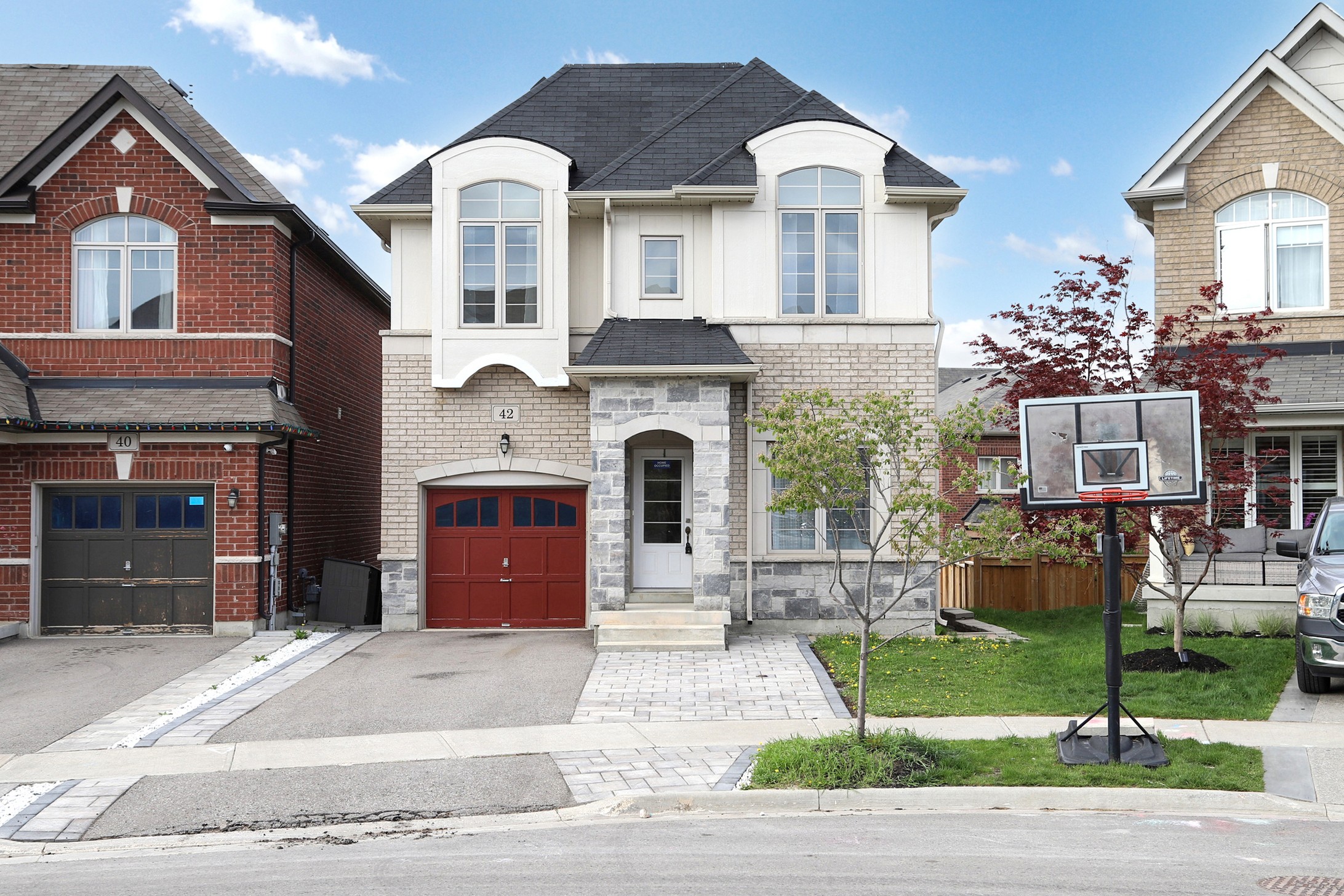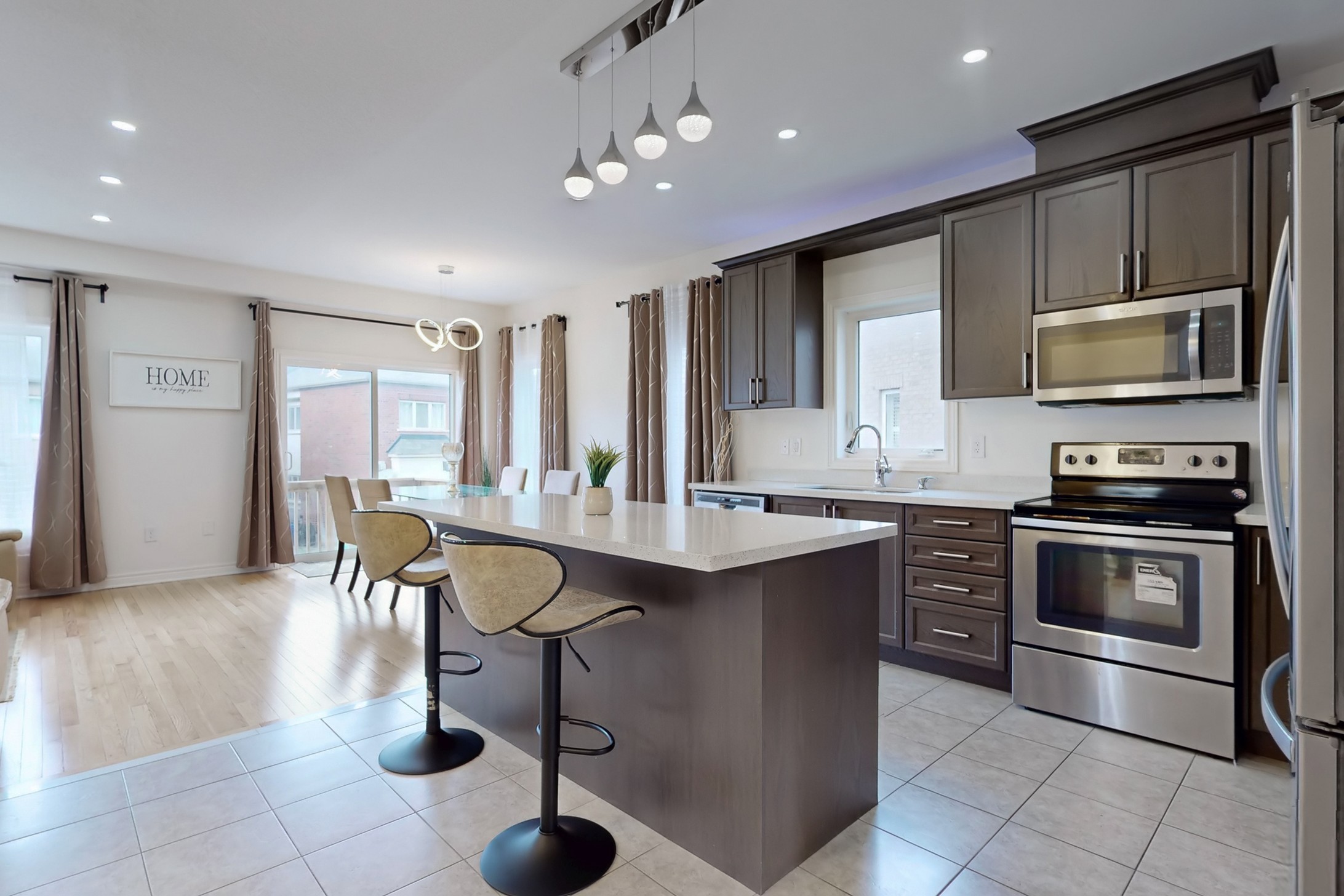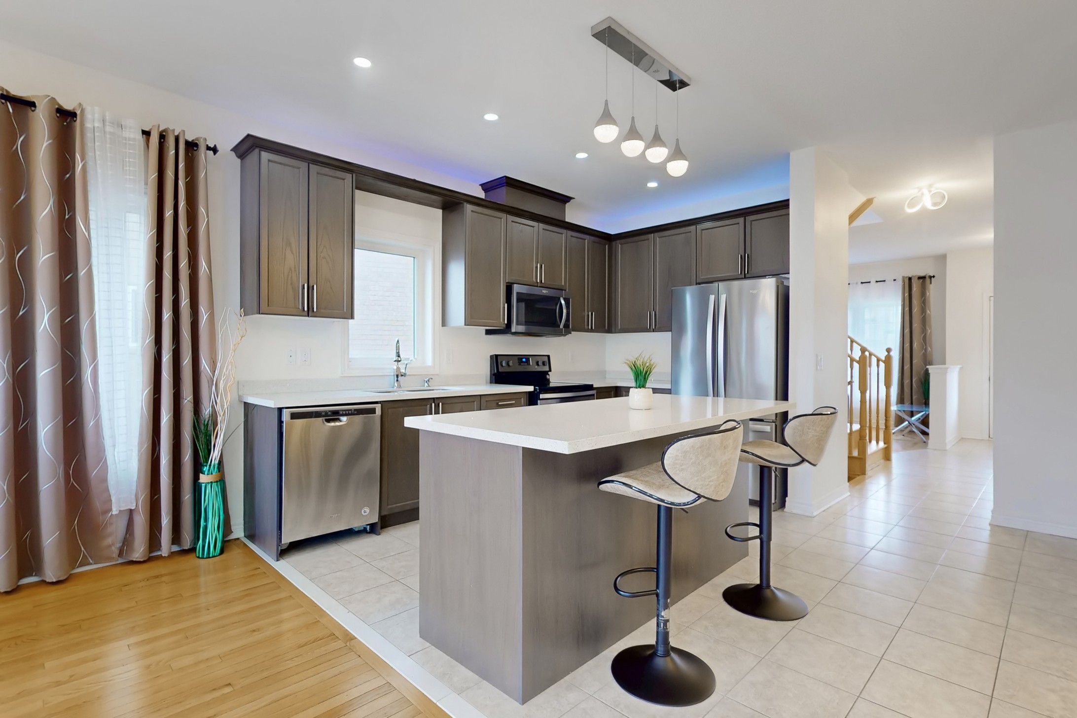 This stunning home, located on a premium pie-shaped lot, offers nearly 3000 square feet of beautifully designed living space. The open-concept layout features 9-foot ceilings, creating a spacious and airy atmosphere. The modern eat-in kitchen is equipped with a large center island, breakfast bar, quartz countertops, and stylish lights/ pot lights. The dining area provides a walkout to the deck and backyard, making it ideal for entertaining. The formal family room includes a cozy gas fireplace for added warmth and comfort. Upstairs, you'll find four generously sized bedrooms, with the convenience of a second-floor laundry room. The custom-finished lookout basement apartment, accessible through a separate entrance, includes a fifth bedroom, a 4-piece bathroom, a second laundry, a full kitchen, and a built-in sound system.