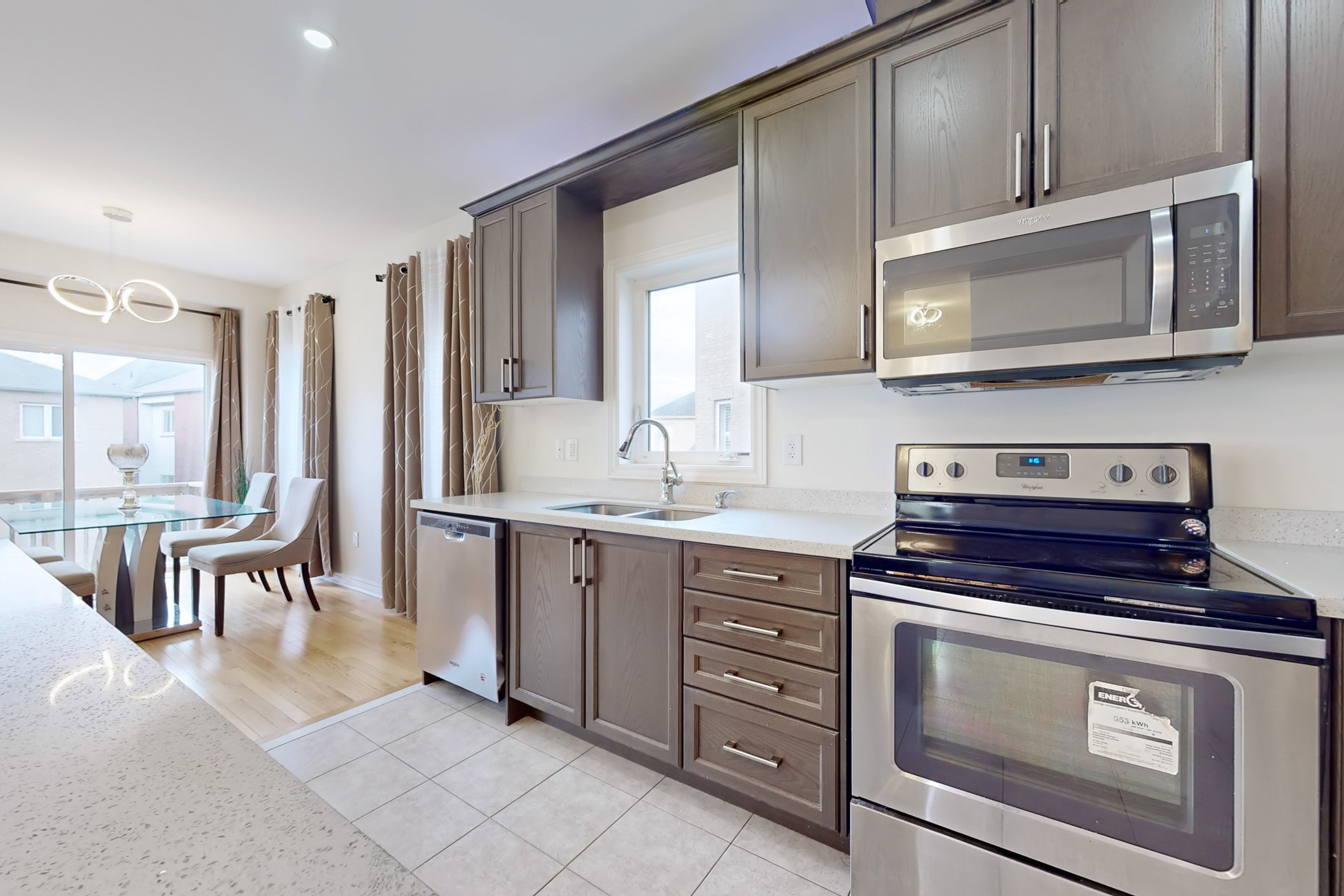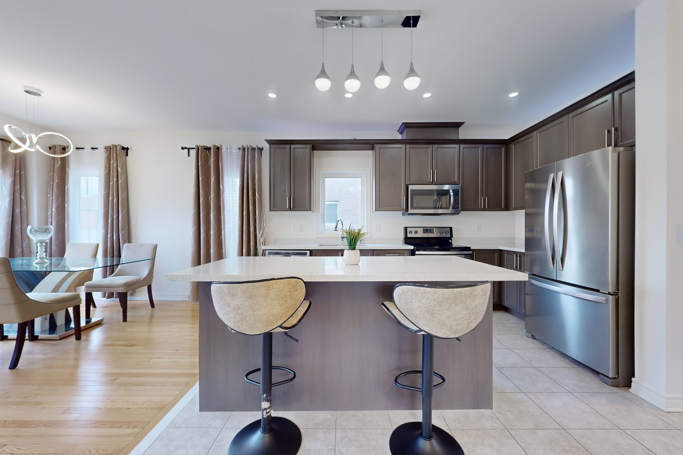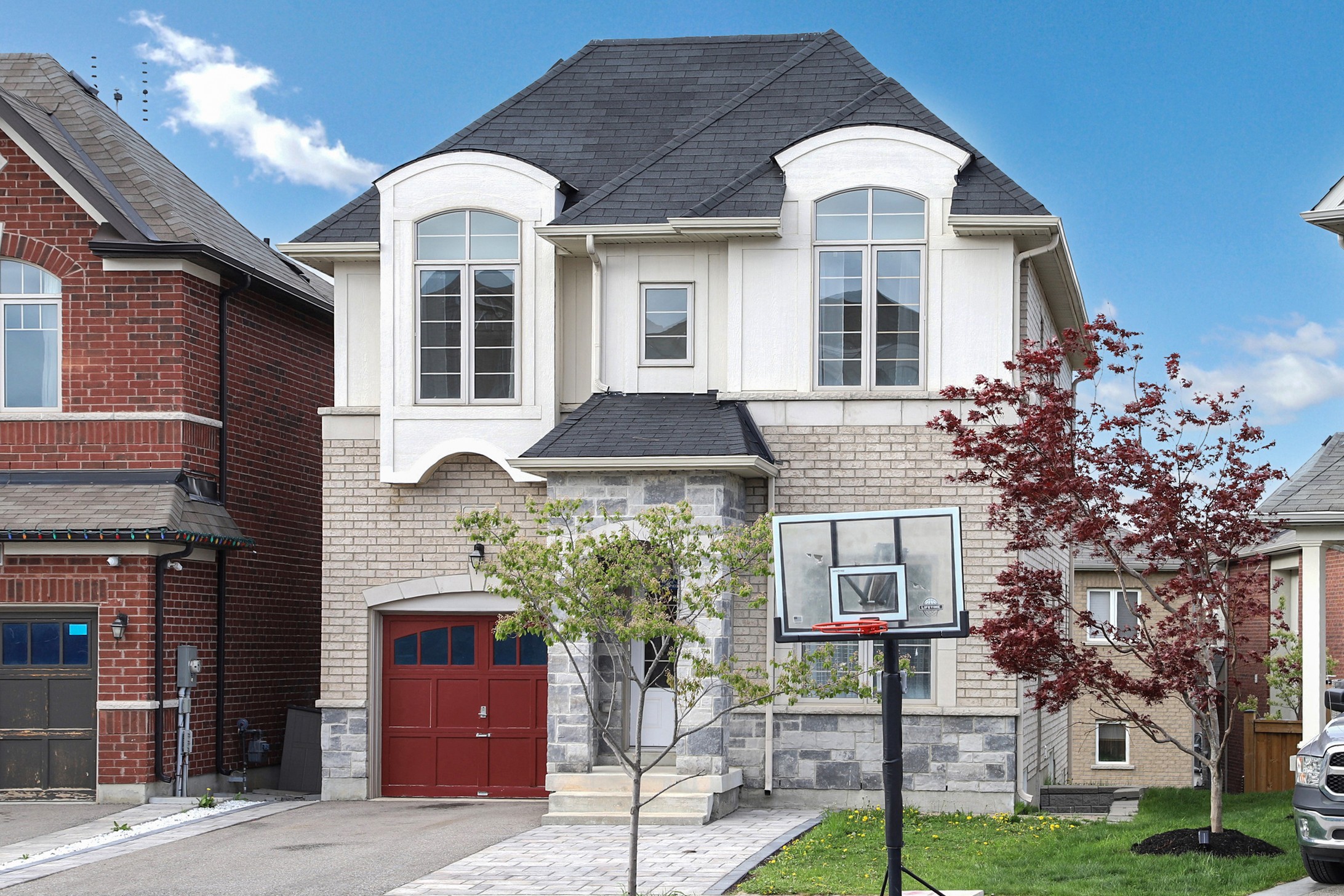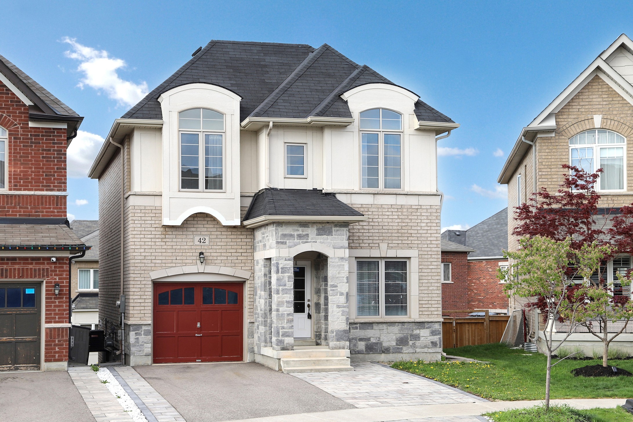 This stunning home, located on a premium pie-shaped lot, offers nearly 3000 square feet of beautifully designed living space. The open-concept layout features 9-foot ceilings, creating a spacious and airy atmosphere. The modern eat-in kitchen is equipped with a large center island, breakfast bar, quartz countertops, and stylish lights/ pot lights. The dining area provides a walkout to the deck and backyard, making it ideal for entertaining. The formal family room includes a cozy gas fireplace for added warmth and comfort. Upstairs, you'll find four generously sized bedrooms, with the convenience of a second-floor laundry room. The custom-finished lookout basement apartment, accessible through a separate entrance, includes a fifth bedroom, a 4-piece bathroom, a second laundry, a full kitchen, and a built-in sound system.