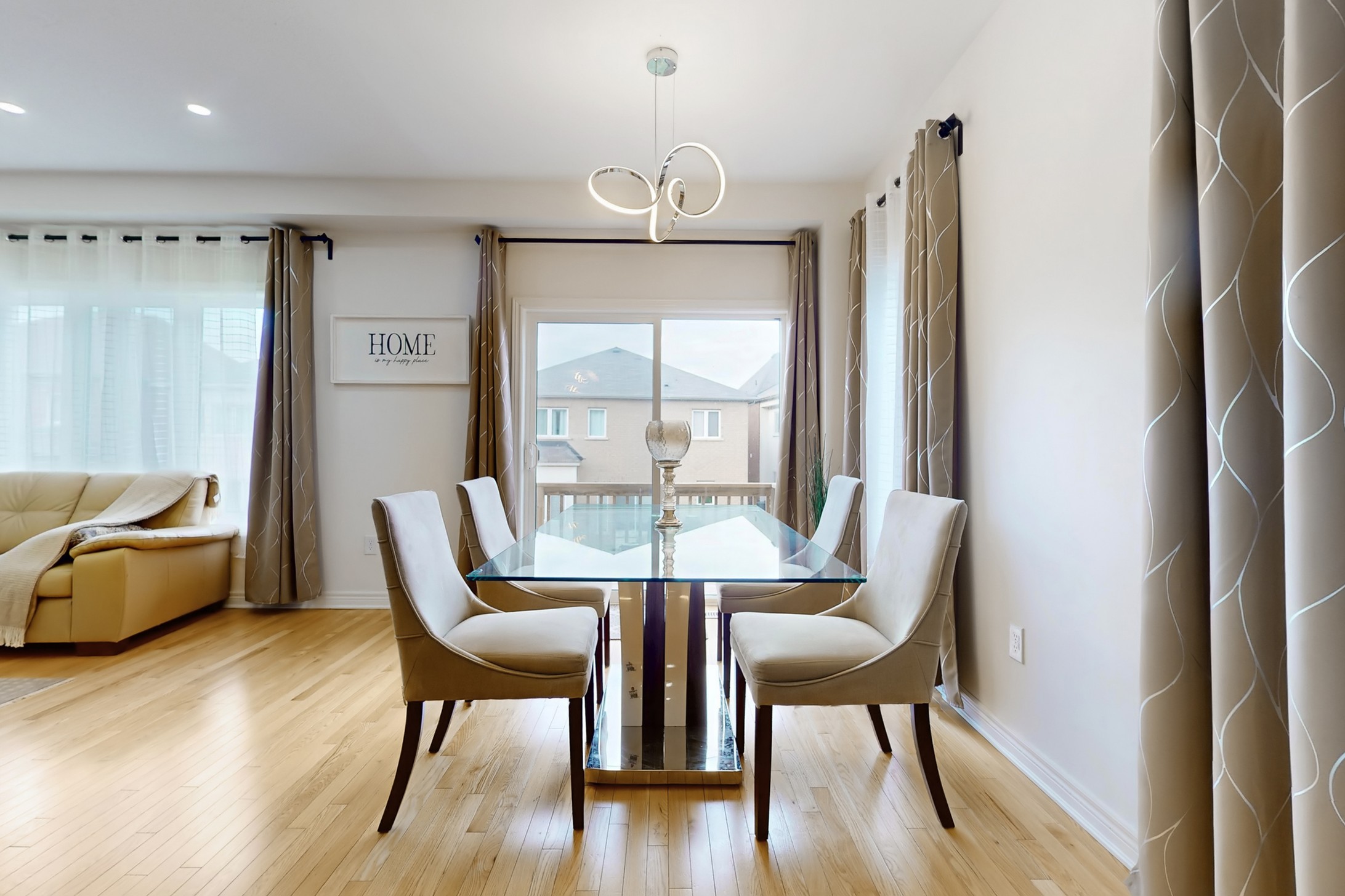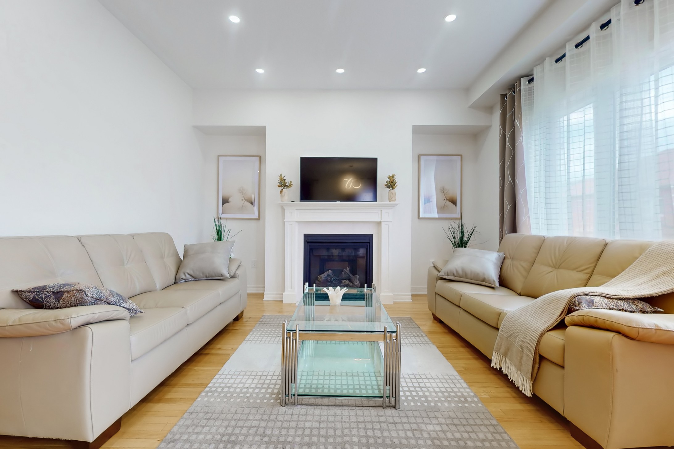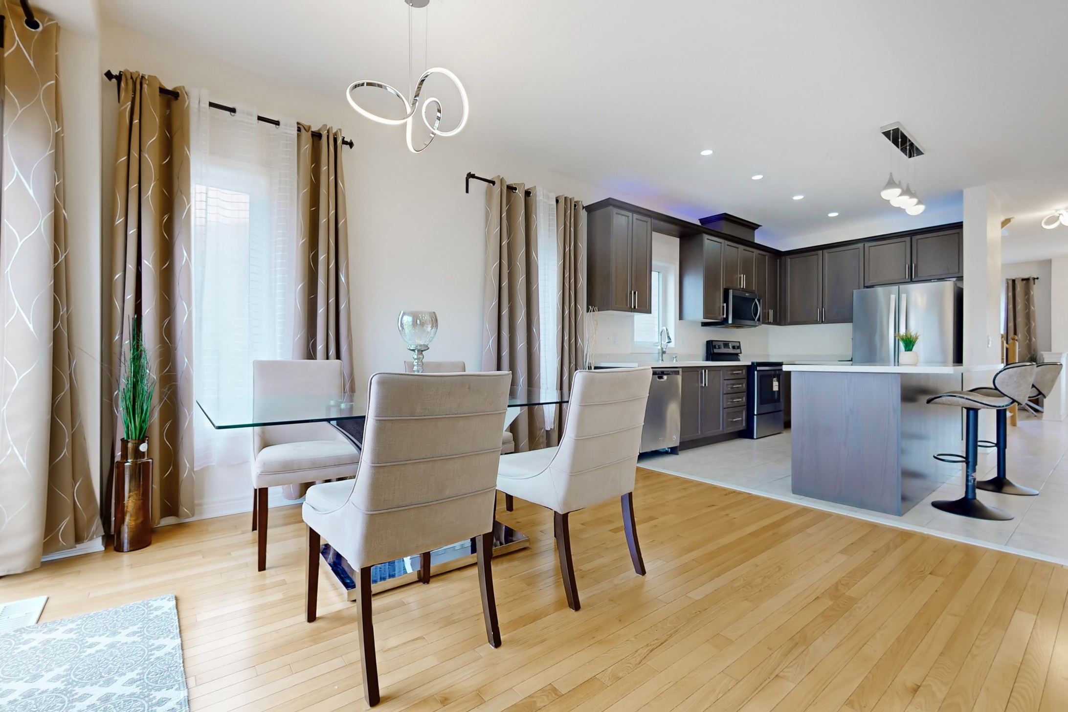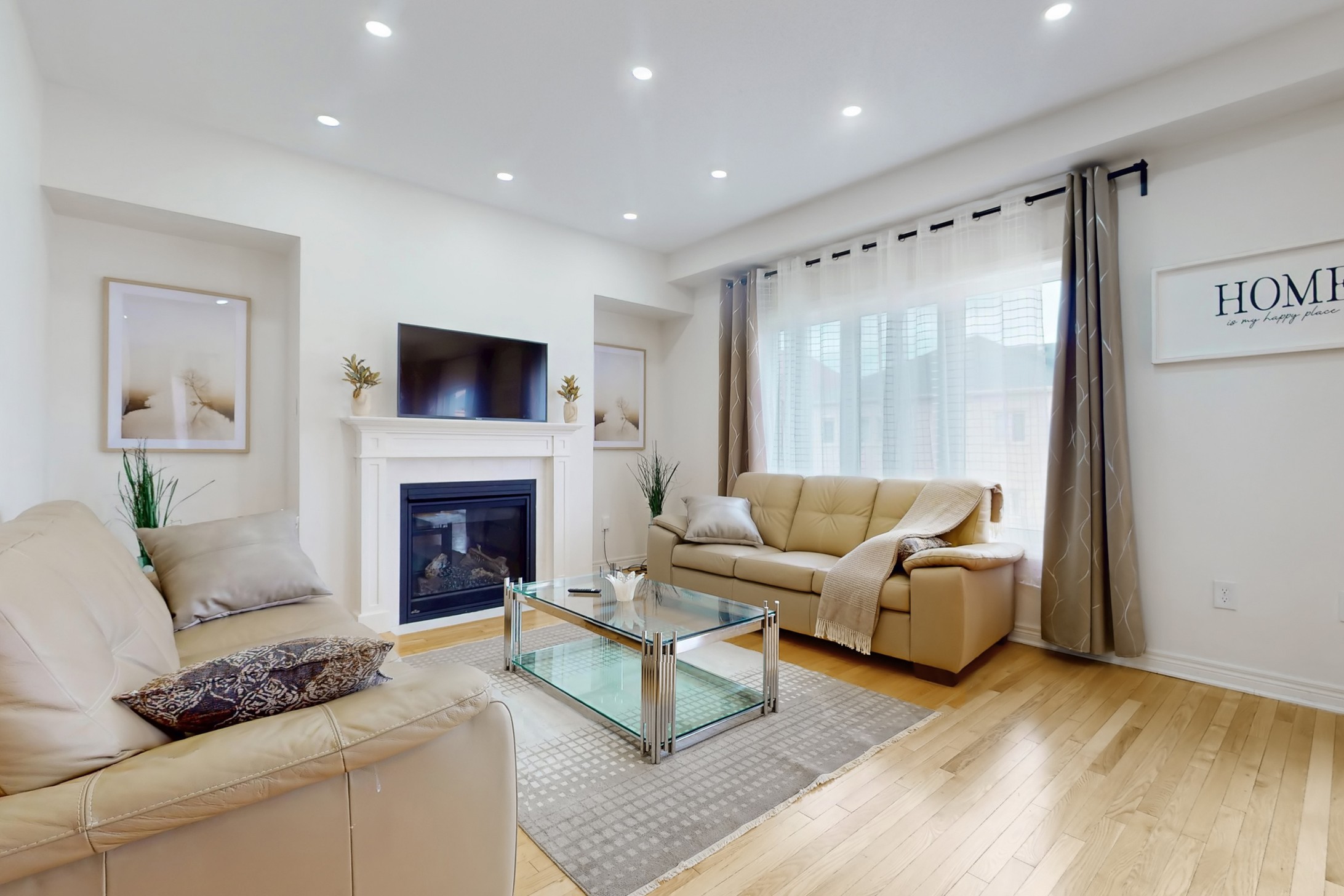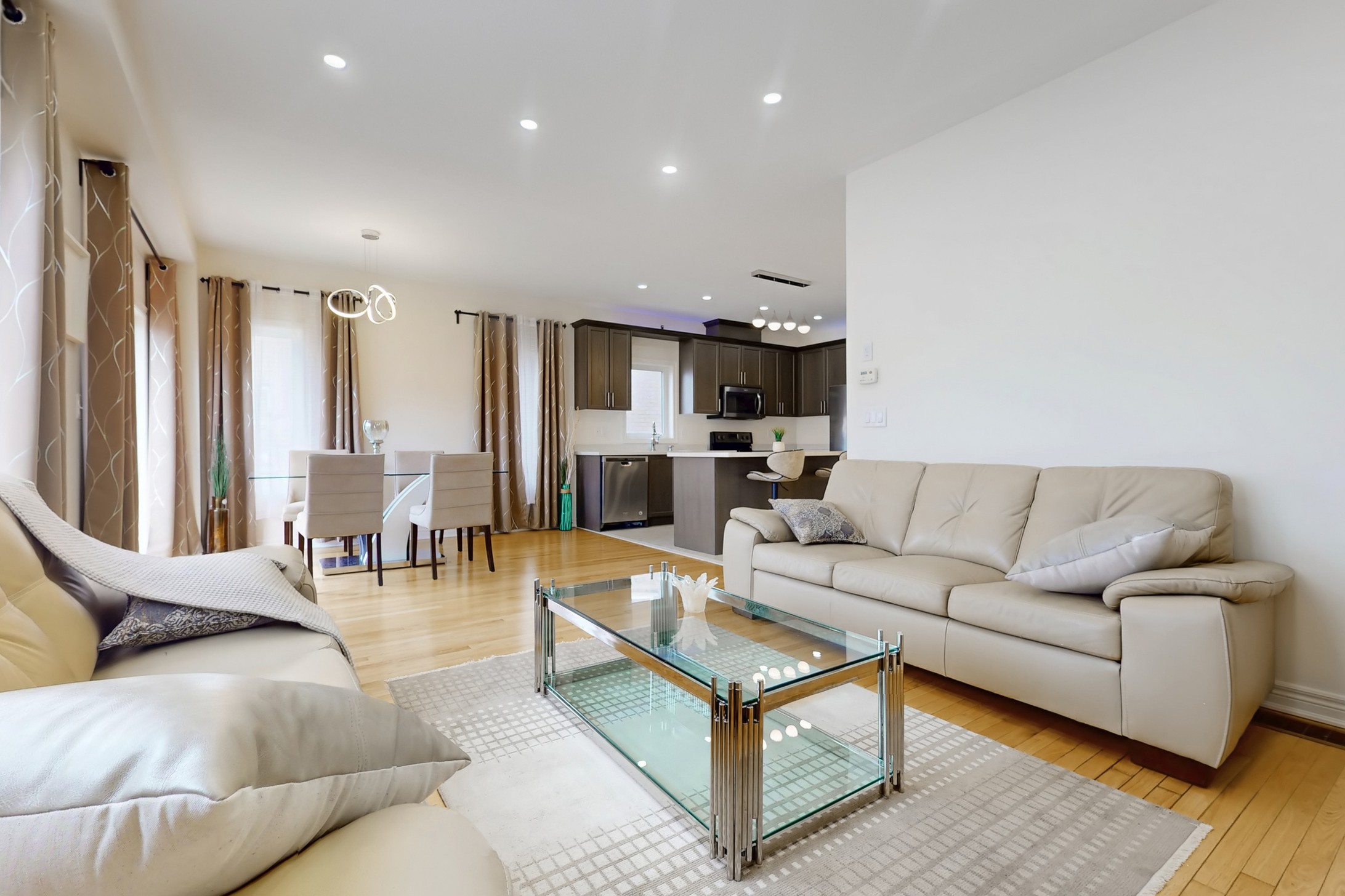 This stunning home, located on a premium pie-shaped lot, offers nearly 3000 square feet of beautifully designed living space. The open-concept layout features 9-foot ceilings, creating a spacious and airy atmosphere. The modern eat-in kitchen is equipped with a large center island, breakfast bar, quartz countertops, and stylish lights/ pot lights. The dining area provides a walkout to the deck and backyard, making it ideal for entertaining. The formal family room includes a cozy gas fireplace for added warmth and comfort. Upstairs, you'll find four generously sized bedrooms, with the convenience of a second-floor laundry room. The custom-finished lookout basement apartment, accessible through a separate entrance, includes a fifth bedroom, a 4-piece bathroom, a second laundry, a full kitchen, and a built-in sound system.